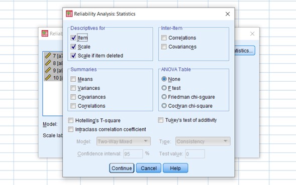 - Analyze > Scale > Reliability Analysis