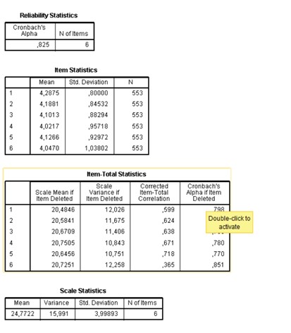 Item- Total Statistics tablosunda "–" varsa o maddeler ters kodlanmalıdır, güvenilirliği düşürüyordur. Burada – madde yok, güvenilirlik de çok yüksek çıkmıştır. Cronbach’s Alpha değeri 0,6’dan yüksek olursa güvenilirliğin iyi olduğu söylenebilir.
