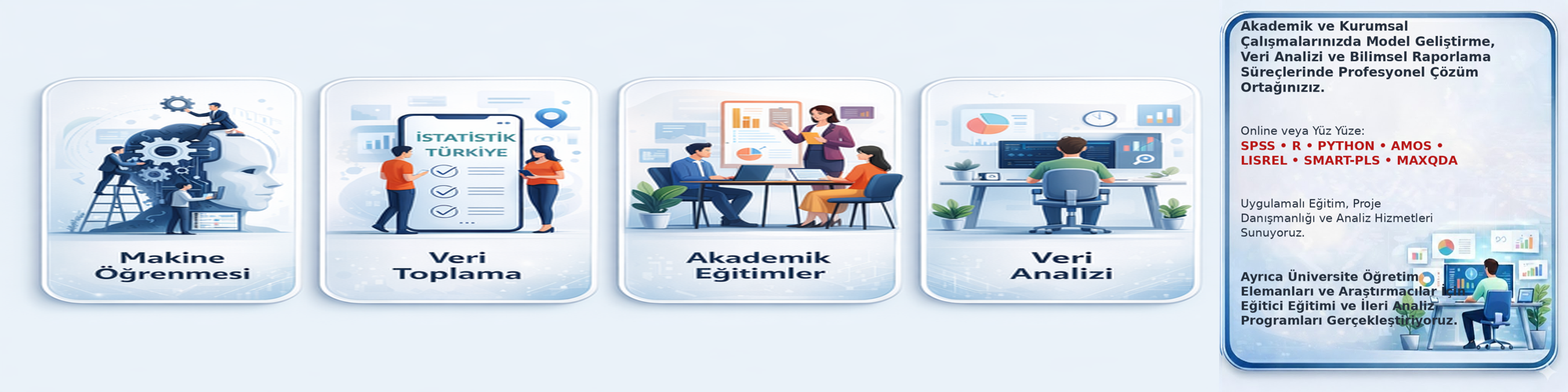 Bizler, buz dağının görünmeyen kısmını görünür kılmaya çalışan veri bilimine gönül vermiş veri bilimcileriyiz. Bizler birçok kurum ve kuruluşlara istatistiki modeller kurulması, pazar araştırmaları, saha çalışmaları, çalışan memnuniyetleri, sürdürülebilir çalışan memnuniyetleri, öğrenci memnuniyetlerin ölçülmesi ve istatistiki veriler doğrultusunda modellenebilmesinin yanı sıra lisans, yüksek lisans ve doktora öğrencilerinin çalışmalarında elde ettikleri verileri,etik değerlere bağlı kalarak, benliğimizdeki çalışanlarımızla, en sağlıklı ve en güvenilir sonuçlara ulaşma gayesini benimsemiş bir ekibimiz.